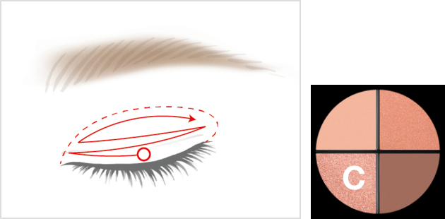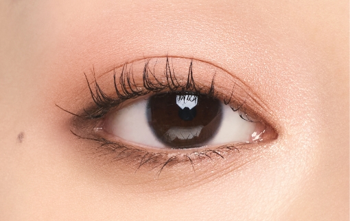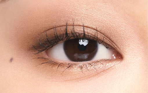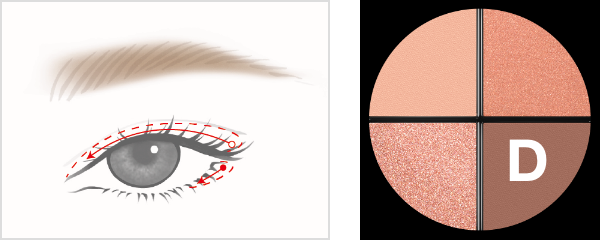 D をチップの先に含ませ、上まぶたの目のキワに塗布した後、下まぶたの1/3程度に塗布し、なじませる。