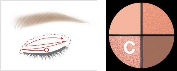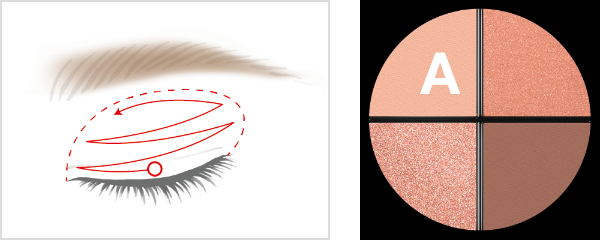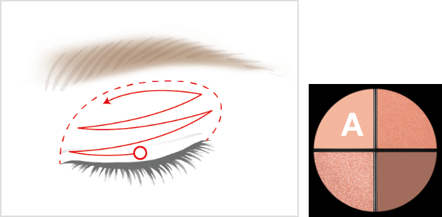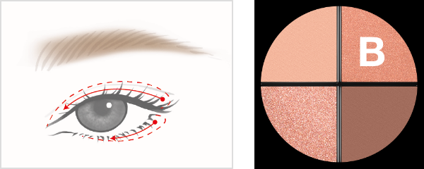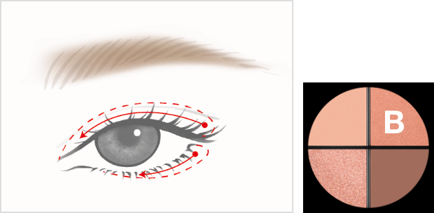 B をチップの広い面に含ませ 上まぶたの二重幅程度に塗布したあと、下まぶたの2/3程度に塗布し、なじませる。