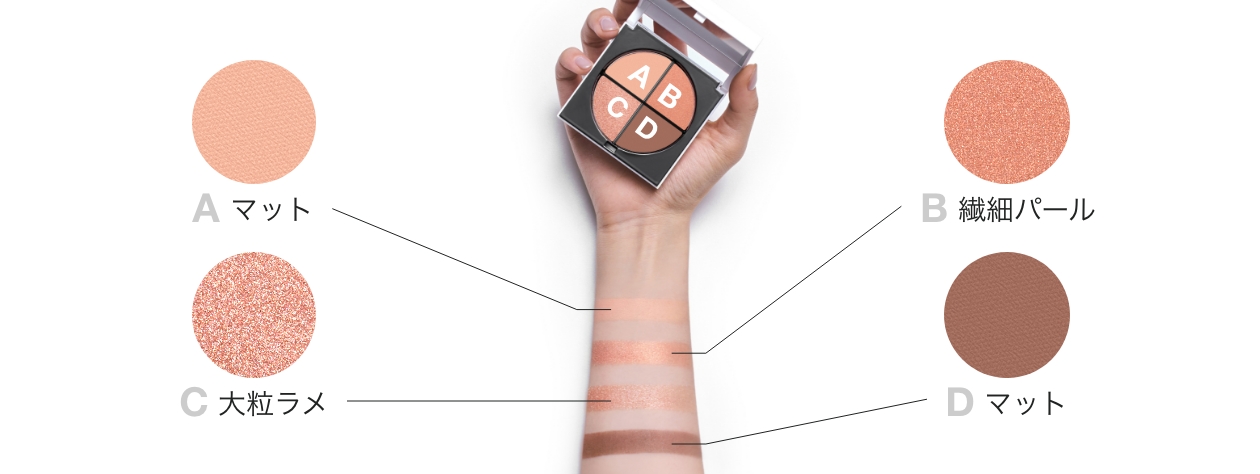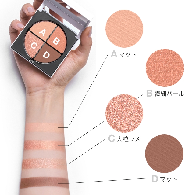 ラメ、パール、マットの異なる質感が多彩な目もと印象を演出。単色でもグラデーションでも美発色な4つのカラーが完成度の高いアイメイクに仕上げます。ヨレにくく、色あせしにくい処方で、一日中、美しい仕上がりをキープ。ホワイトチアシードエキス*をはじめとする独自処方が、メイクをしている間も、まぶたを健やかにケアします。