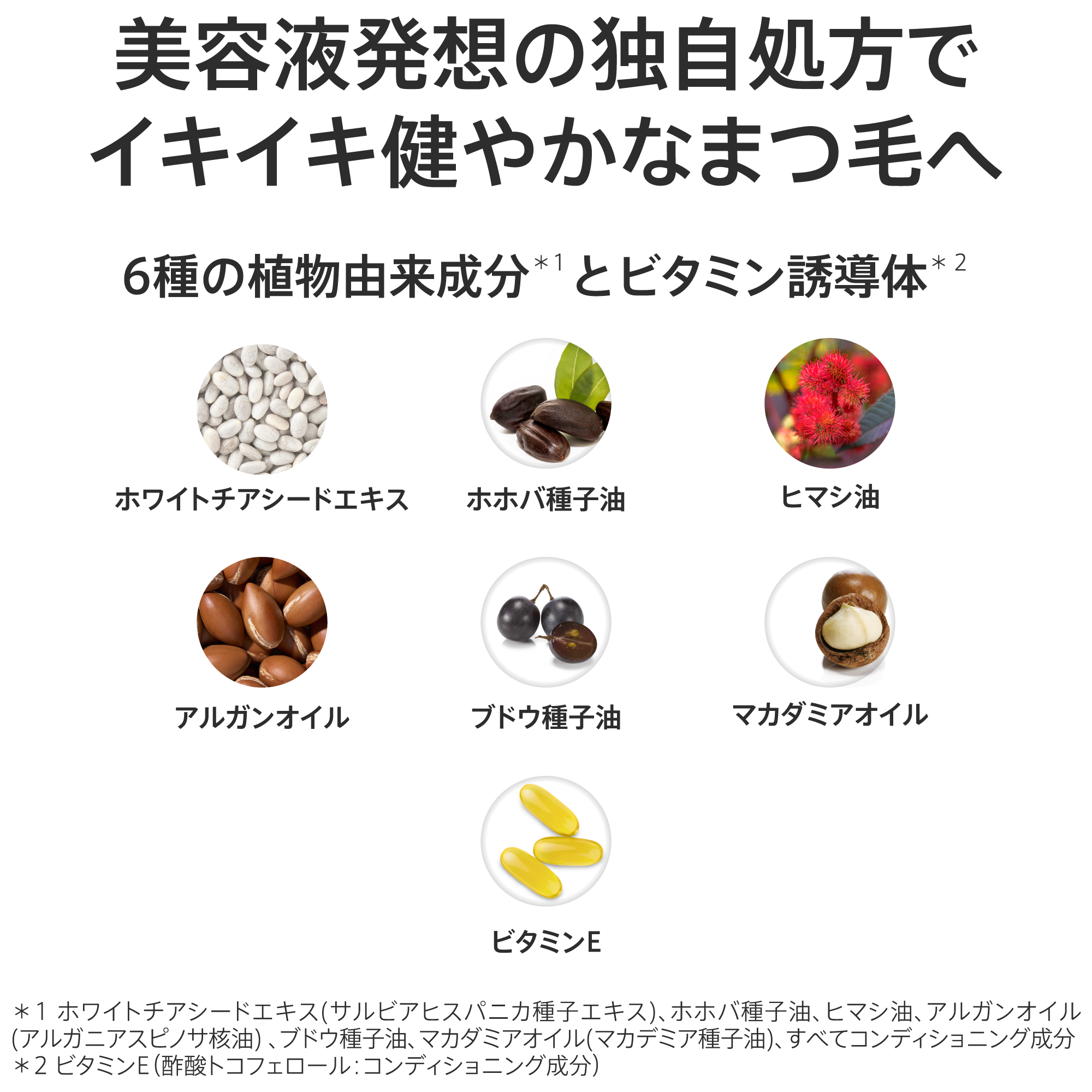 • *2 ホワイトチアシードエキス(サルビアヒスパニカ種子エキス)、ホホバ種子油、ヒマシ油、アルガンオイル(アルガニアスピノサ核油) 、ブドウ種子油、マカダミアオイル(マカデミア種子油)、すべてコンディショニング成分