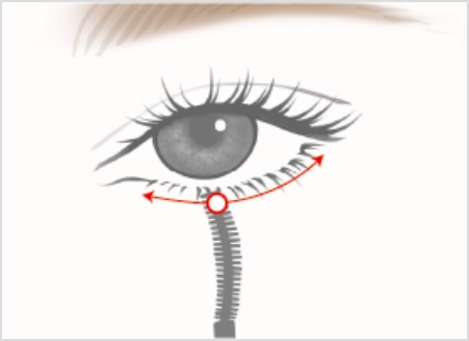 下まつ毛は、ブラシについた余分な液をティッシュ等で拭きとってから、ブラシを立てて左右に動かしながら、塗布する。塗布後、ブラシを横に戻して、毛流れを整える。
