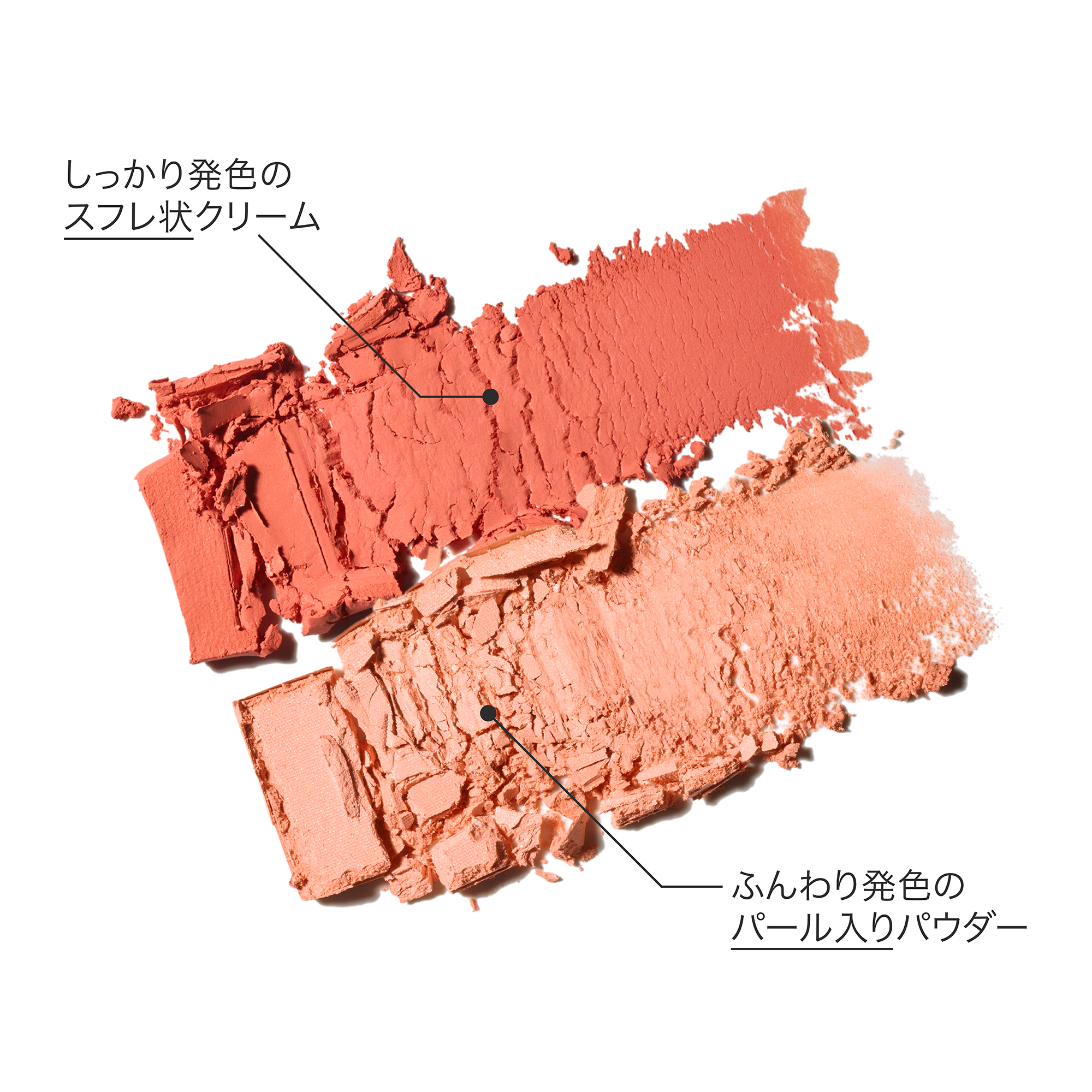 にじみ出るような血色感を与える、さらっと軽いスフレ感ある「クリーム」と、ふんわりソフトな発色の「パウダー」を1つのパレットにイン。単色使いはもちろん。重ねづけで深みと立体感のある仕上がりも簡単に叶えます。肌に寄り添うスキンケア成分配合のチークで、思い通りのヘルシーな血色感を一日中。さあ、今日はどのニュアンスでいく?