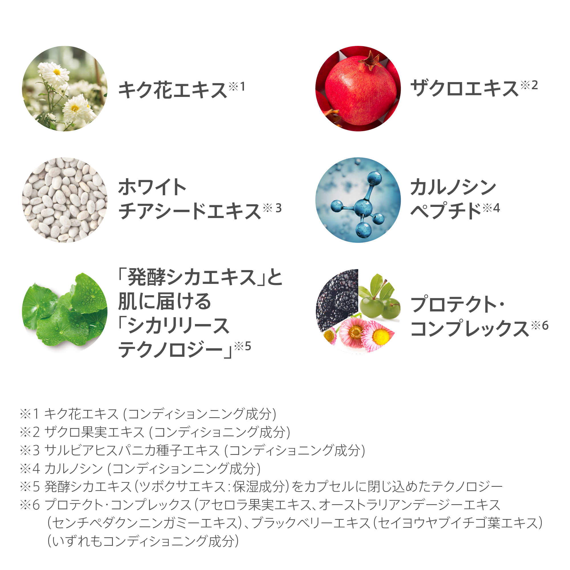 ※2 独自成分:ホワイトチアシードエキス(サルビアヒスパニカ種子エキス:保湿成分)、発酵シカエキス(ツボクサエキス:保湿成分)、ザクロエキス(ザクロ果実エキス:コンディショニング成分)、キク花エキス(コンディショニング成分)、プロテクト・コンプレックス(アセロラ果実エキス、オーストラリアンデージーエキス(センチペダクンニンガミーエキス)、ブラックベリーエキス(セイヨウヤブイチゴ葉エキス)、いずれもコンディショニング成分)