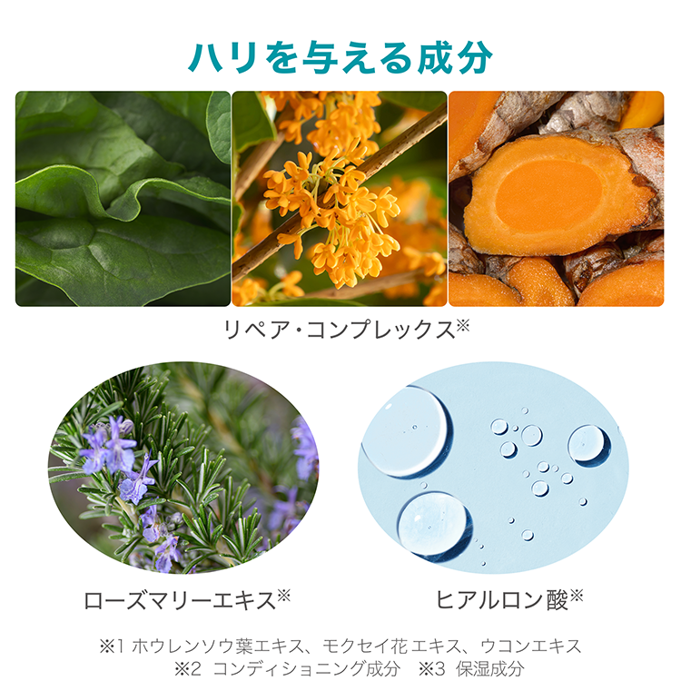 ※ホウレンソウ葉エキス、モクセイ花エキス、ウコンエキスから成る、ハリを与える成分