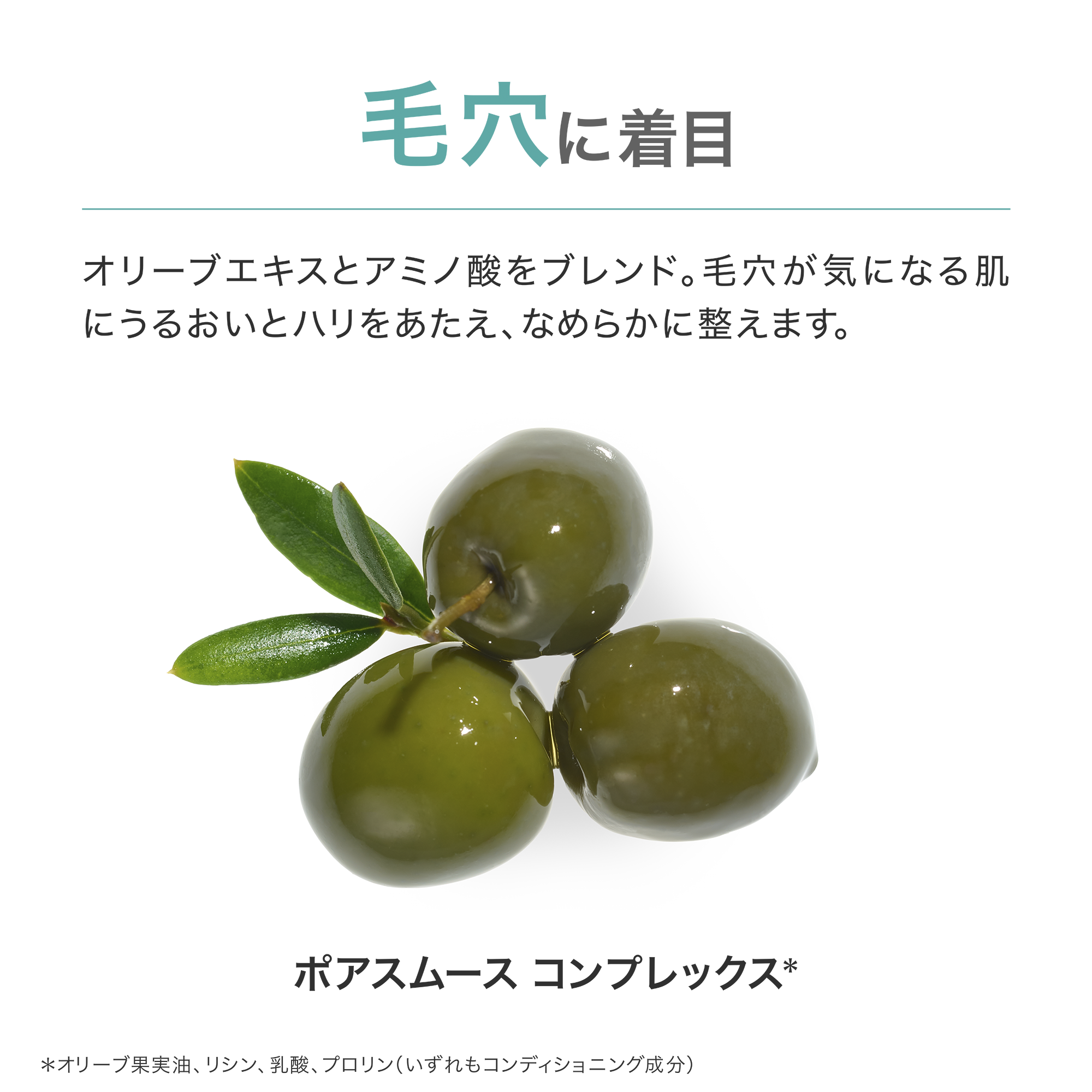 オリーブエキスとアミノ酸をブレンド。毛穴が気になる肌に、うるおいとハリをあたえ、なめらかに整えます。