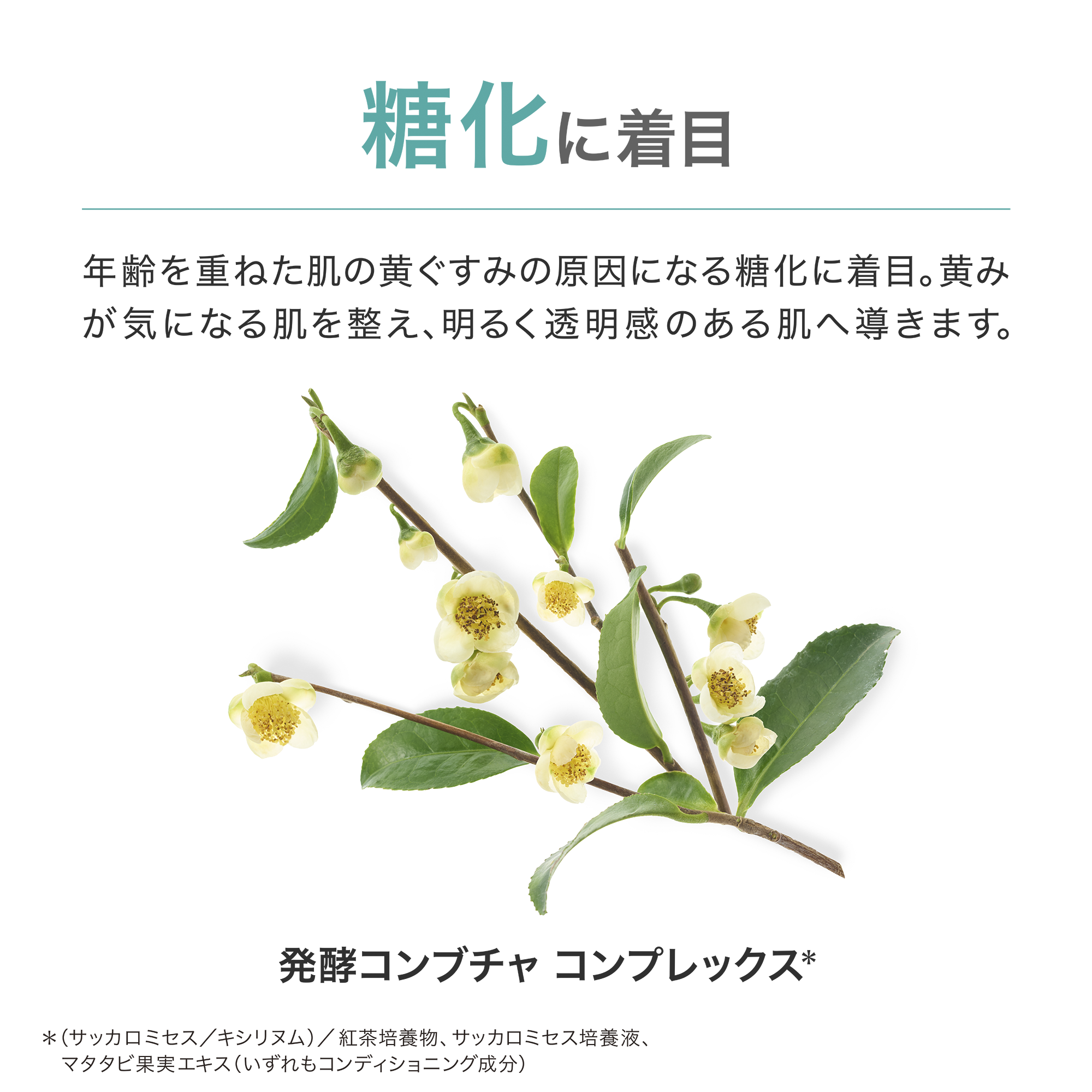 年齢を重ねた肌の黄ぐすみの原因となる糖化に着目。黄みが気になる肌を整え、明るく透明感のある肌へ導きます。